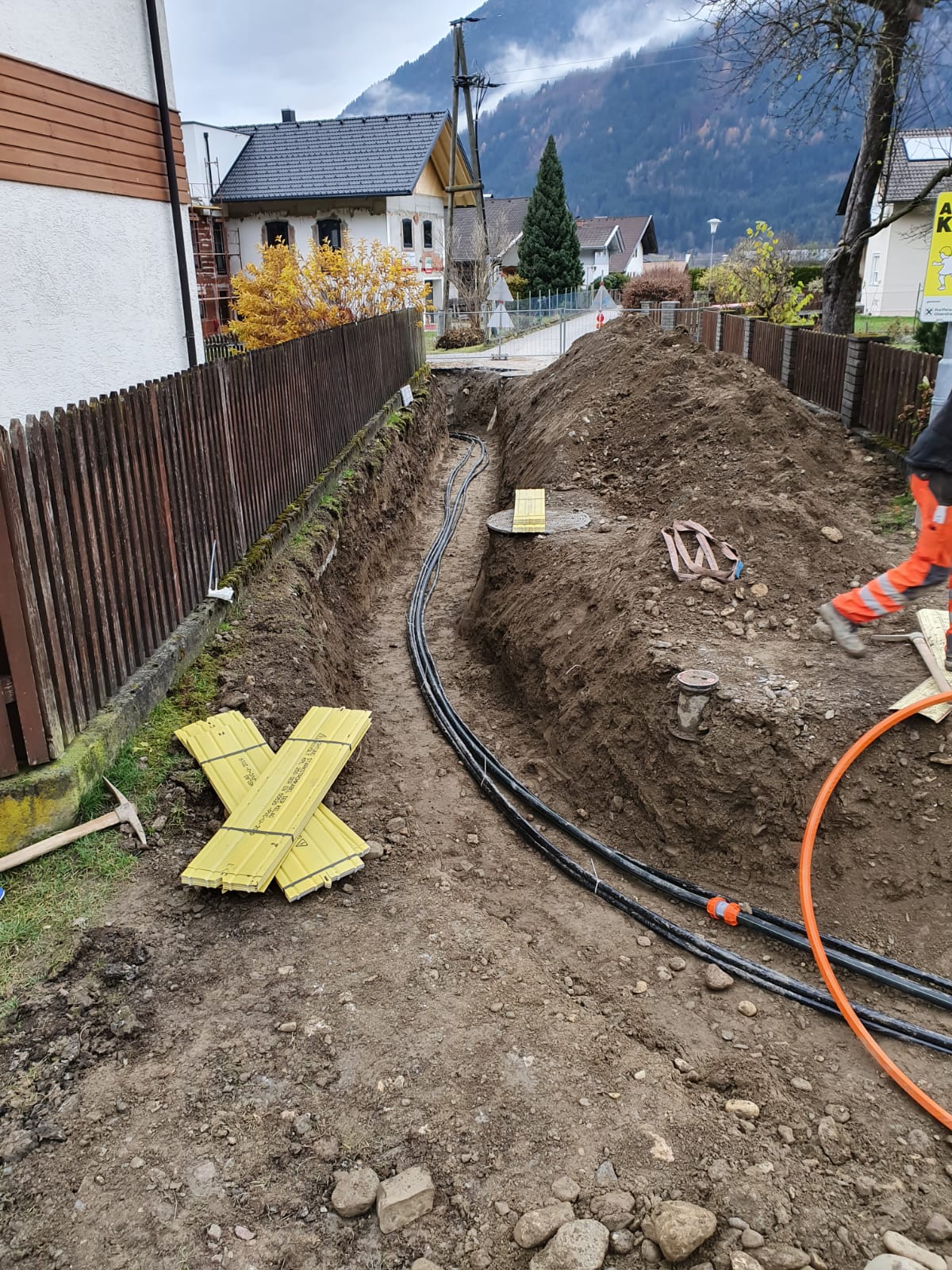 Die Verlegung von Kabel zur Versorgung der Baugrundstücke mit Strom, Telefon und Ortsbeleuchtung ist ebenfalls geplant.