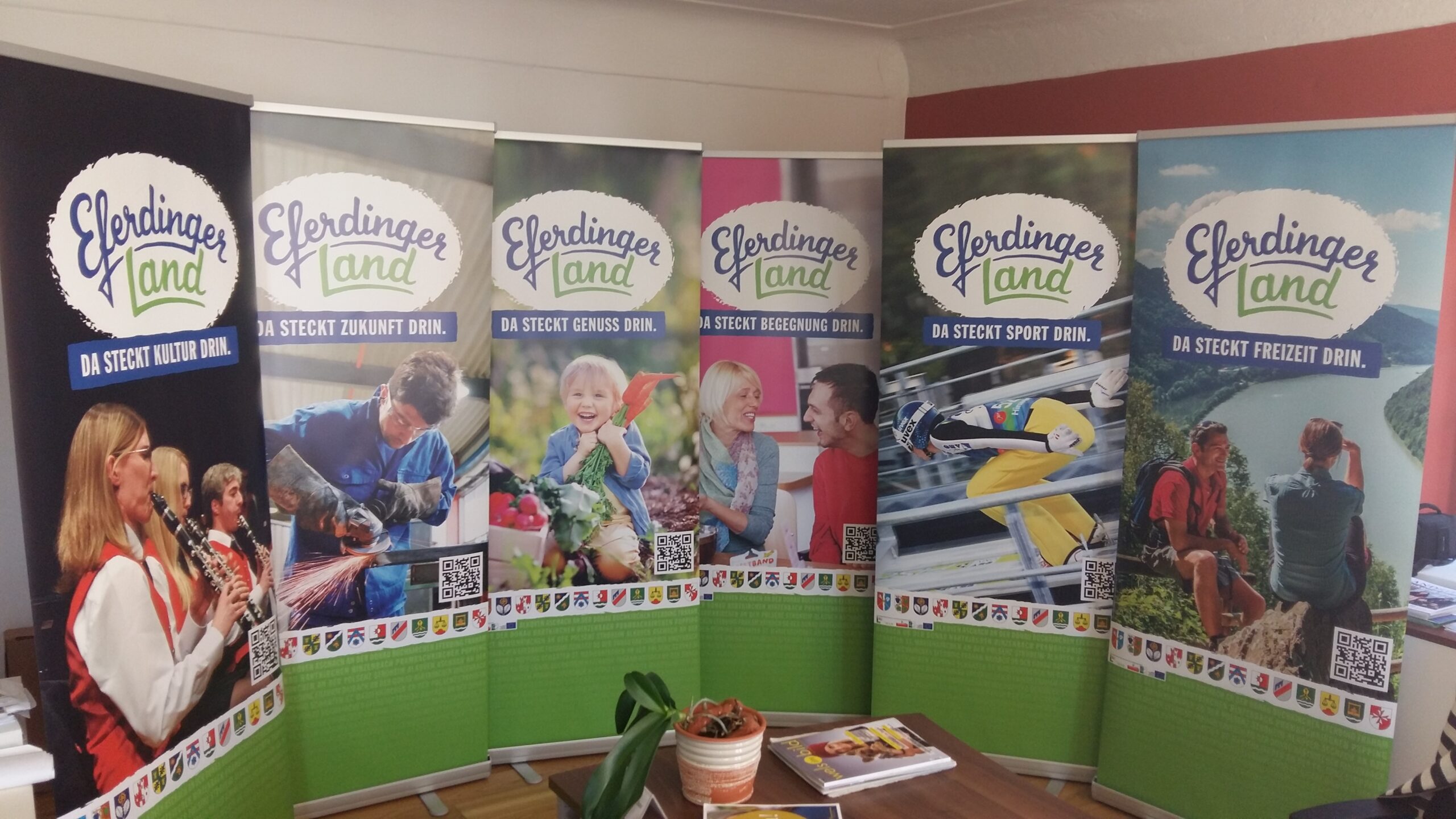 - Erstellen von Drucksorten und Marketingtools zur Kommunikation in einheitlichem Layout „Eferdinger Land“, um einen Wiedererkennungseffekt zu erzeugen: roll ups, Freecards, Imagefolder für die Region inkl. Flügelmappe, Gemeindezeitungsvorlagen, Aufkleber, Präsentationsvorlagen, Einlageblätter für Gastronomie, Bezirks-Einfahrtstafeln, beachflags, Transparente, Bezirksfreizeitkarte, neue Freizeitwege-Tafeln, Vorlagen und Deckblätter für div. Publikationen, usw.
