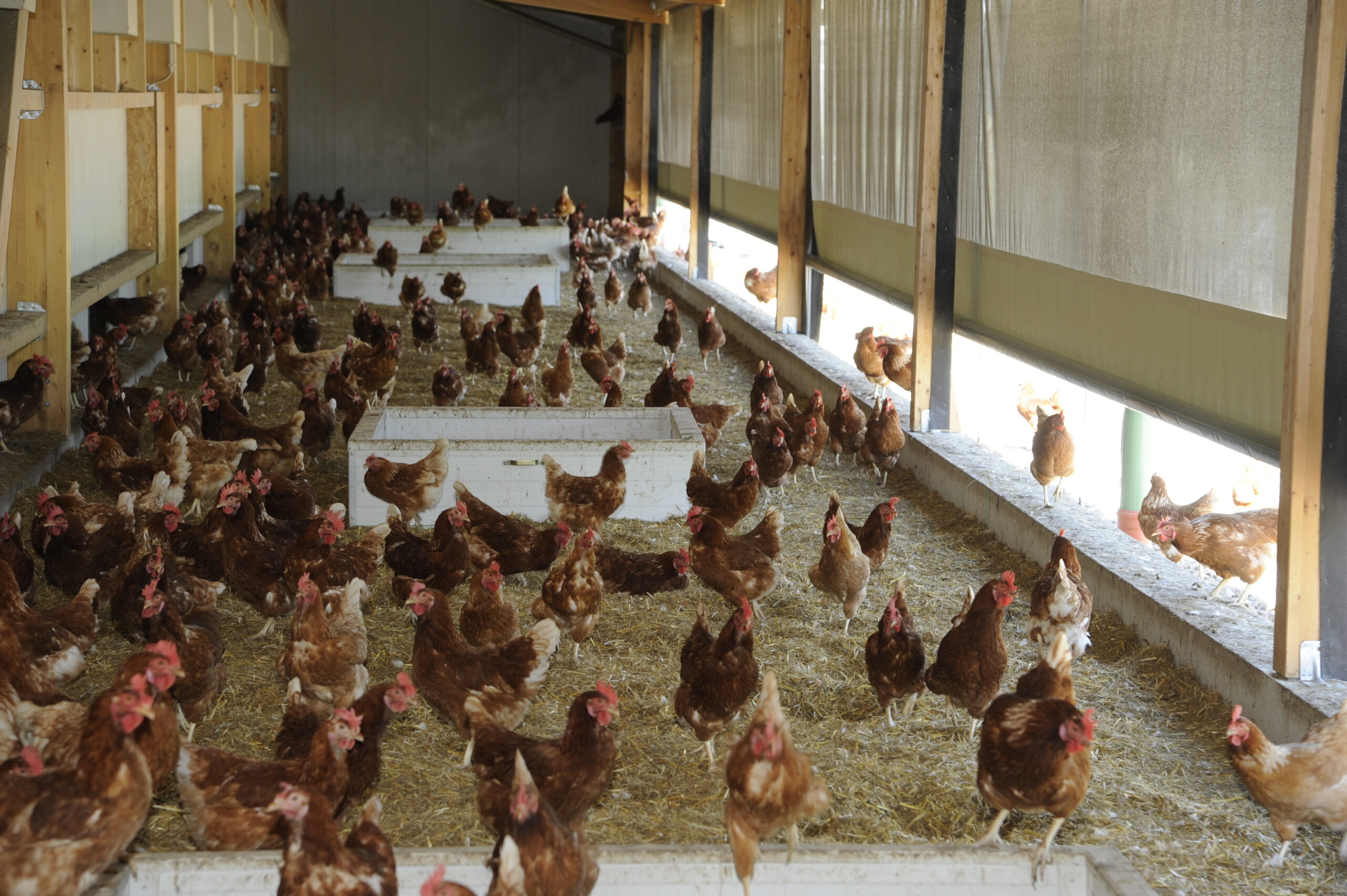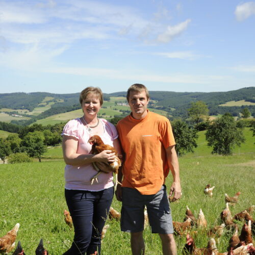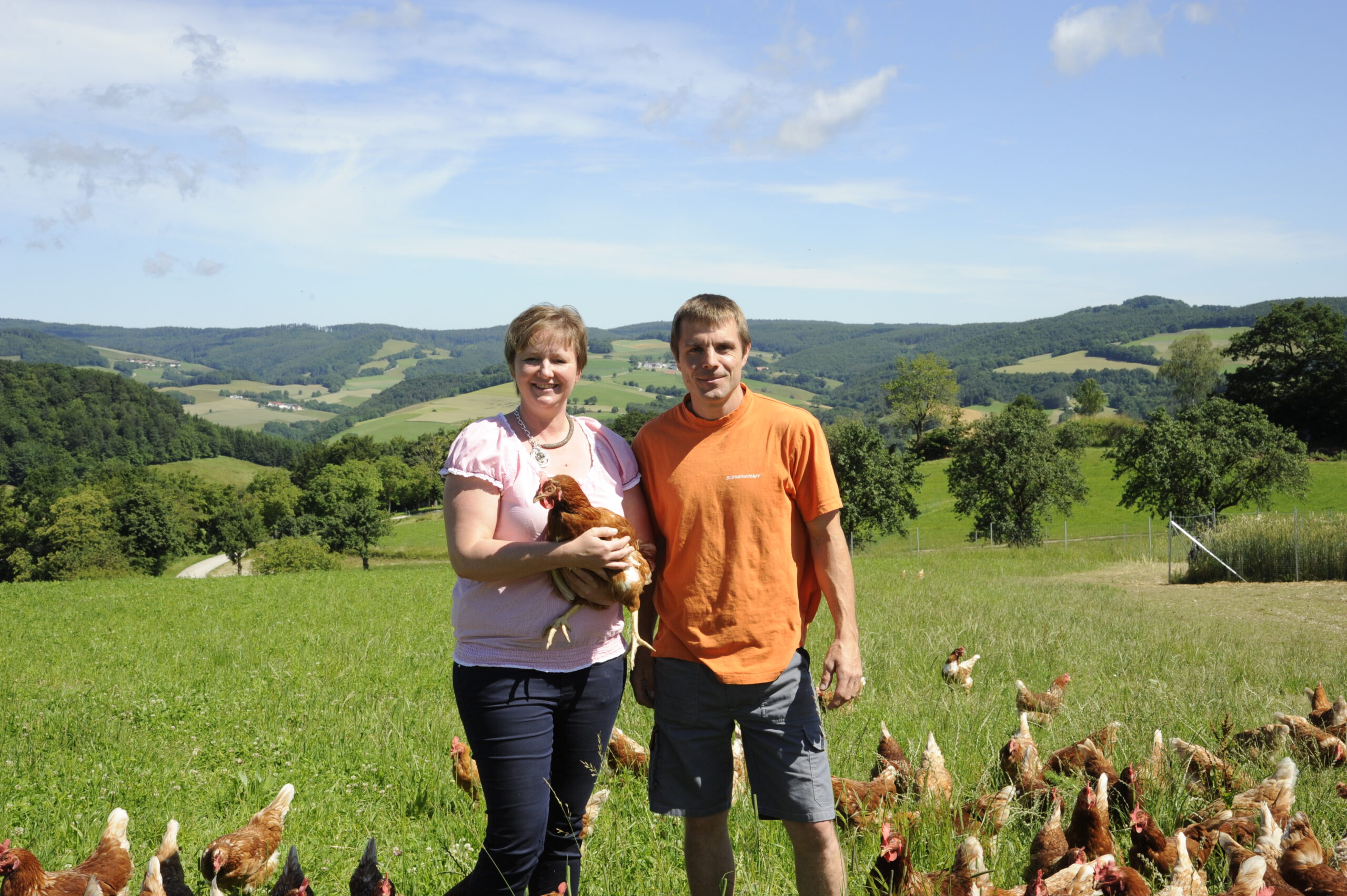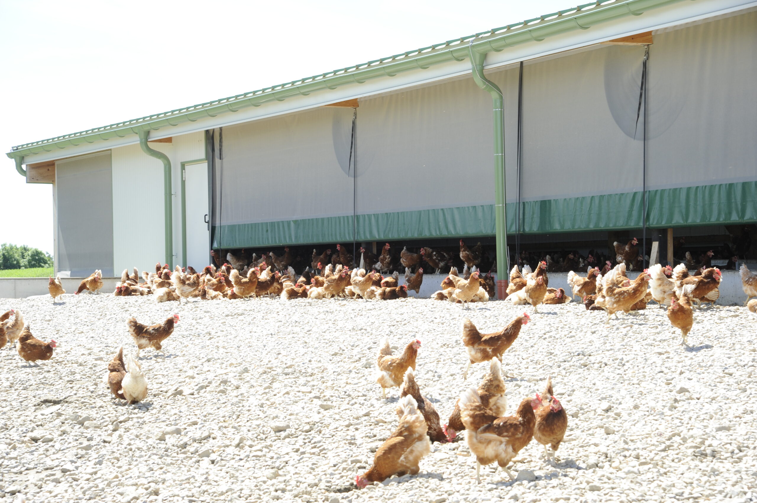 Michael Oberger und seine Lebensgefährtin Monika sind im niederösterreichischen Schwarzenbach von Milchvieh auf Bio-Legehennen umgestiegen. Ausschlaggebend für diese Entscheidung war einerseits der Wunsch nach einer Absicherung des Einkommens und andererseits strebten die beiden eine weniger körperliche und weniger arbeitsintensive Wirtschaftsweise und damit eine Steigerung der Lebensqualität an. 2015 errichteten sie einen Stall für insgesamt 6.000 Bio-Legehennen. Der Stall unterteilt sich in zwei Herden zu je 3.000 Hennen. Ein Außenscharrraum, sechs Hektar Auslauf und genügend Tageslicht sowie Beschäftigungsmöglichkeiten, wie etwa Staubbäder sorgen dafür, dass sich die Tiere wohl fühlen. Ein Förderband bringt die mit Dinkelspelzen ausgekleideten Nester zur Eiersammelstelle, wo die Eier mit dem Erzeugercode (=Betriebsnummer) bedruckt werden. Verpackt von der Firma Schlögl Ei werden die Eier unter der Marke „Zurück zum Ursprung“ vermarktet. Die Investitionskosten belaufen sich auf 830.000 Euro brutto. Als anrechenbare Kosten zum Projekt wurden 615.000 Euro netto (zirka 740.000 Euro brutto) vorgelegt. Die Förderung beträgt 120.000 Euro ohne Agrarinvestitionskredit.