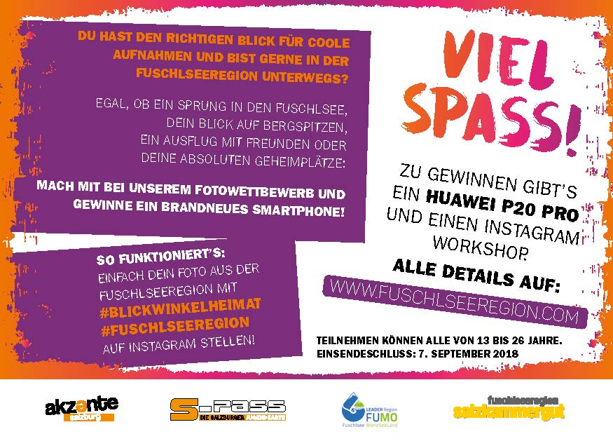 Hier stand im Vordergrund, für die jugendlichen BewohnerInnen der Region einen Anreiz für die eigene Heimat, Landschaft sowie das Angebot zu schaffen. Sie setzten sich mit den Themen auseinander und bildeten auf kreative Weise mit Instagram-Posts neue Blickwinkel ihrer Heimat ab. Von 1. Juni bis 30. September 2018 konnten die Jugendlichen auf Instagram Bilder mit einem speziellen Hashtag hochladen und damit am Voting teilnehmen. Ausschlaggebend war für den Sieg, dass das Bild den Community Richtlinien sowie den Gewinnspiel Richtlinien entspricht (Diese wurden mit der Ausschreibung ausgegeben.) Die Fotografen der 10 Bilder, die nach dem Ende des genannten Zeitraums die meisten Likes hatten, wurden zum Workshop eingeladen und durften diesen absolvieren. Infos wie z.B. was poste ich, wie wähle ich das richtige Motiv aus, welche Funktionen bzw. Filter setze ich ein werden hier vermittelt. Ein gemeinsames Hashtag #blickwinkelheimat #fuschlseeregion bildete schließlich alle geposteten Inhalte ab – dieses wurde auch in der bereits vorhandenen Social Wall der www.fuschlseeregion.com-Webseite integriert und konnte hier eingesehen werden. Alle Inhalte wurden der Urlaubsregion Fuschlsee zur Verfügung gestellt. Der Sieger des Wettbewerbes selbst erhielt ein Smartphone. Der Jugendwettbewerb wurde gemeinsam mit Akzente Salzburg durchgeführt. Über deren Kanäle wie Newsletter, Homepage, Printmedien etc. wurde das Voting beworben.
