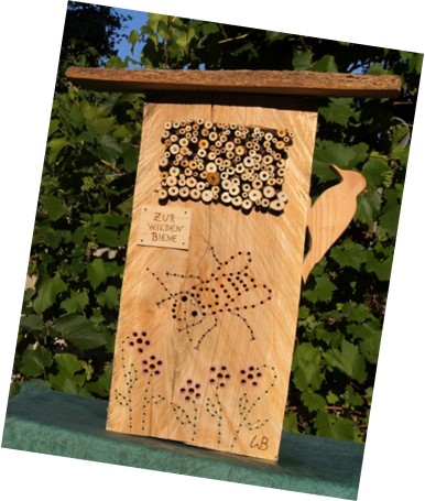 • Errichtung und Aufstellung von künstlichen Nisthilfen Unter Einbezug regionaler Tischler sowie der Lebenshilfe werden künstliche Nisthilfen aus Holz errichtet. Diese werden begleitend von einer ansprechenden Informationstafel zentral in den Gemeinden, sowie an strategisch günstigen Plätzen in der Natur aufgestellt. Dadurch wird nicht nur zusätzlicher Platz zum Nisten für Wildbienen bereitgestellt, es wird auch die Sensibilisierung der Bevölkerung gefördert.