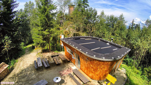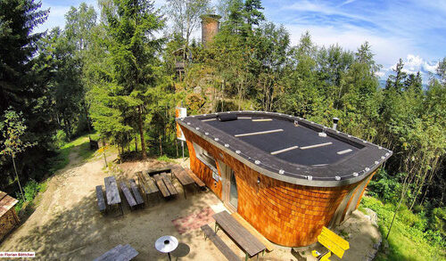 Ein umfunktionierter Bauwagen fungiert als “Raststation” für die vielen Besucherinnen und Besucher der Aussichtsplattform Hoh-Haus am Buchberg in Lasberg. Nach Fertigstellung des Bauvorhabens Hoh-Haus soll nun der Bauwagen durch eine Hütte ersetzt werden. Das Projekt Hoh-Haus wurde von vielen regionalen Wirtschaftstreibenden gefördert und die Nachhaltigkeit ist durch den Einkauf der Verpflegung von regionalen Anbietern (z.B. Kaufhaus Lindner im Ort) gegeben. Die regionalen Gasthäuser profitieren bislang ebenfalls durch die Schaffung dieses Projektes, da sich diese als Startpunkt der Wanderung sehr gut anbieten und ein Großteil der Besucherinnen und Besucher diese nach der Wanderung ebenfalls noch aufsuchen.