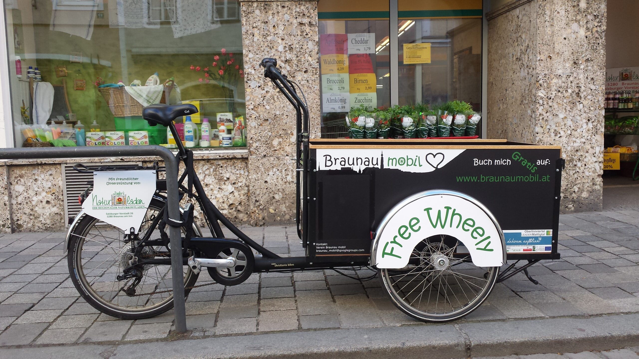 - Das Lastenrad muss unter www.braunaumobil.at im Vorfeld gebucht werden. Das Rad kann dann beim Zagler´s Naturkostladen, Salzburger Vorstadt 26, abgeholt werden. (Braunauer Innenstadt).