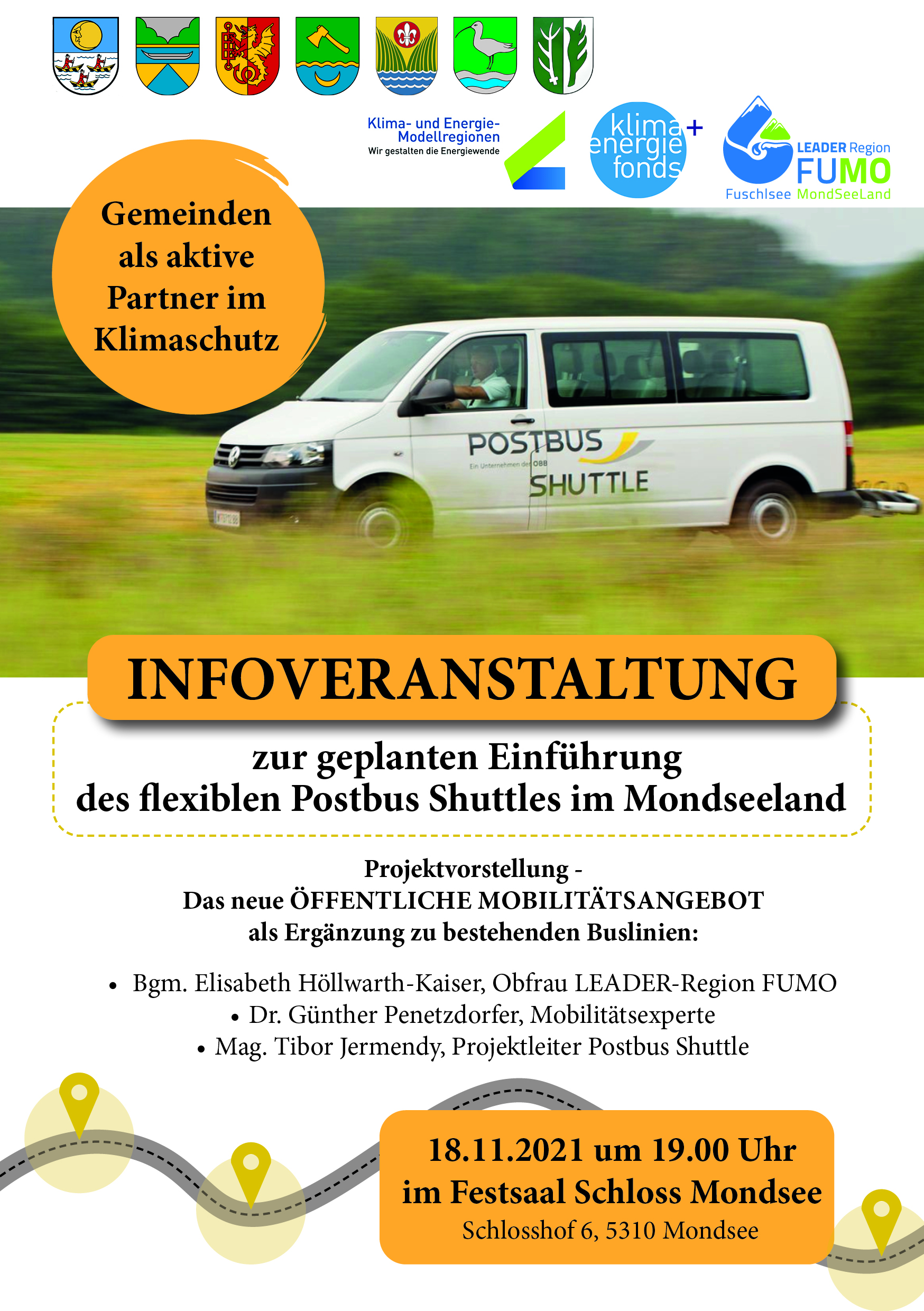 Die Covid-19- und die Klimakrise erhöhen den politischen Handlungsdruck so stark wie nie zuvor. Bestärkt durch die Regierung und die Länder mit ehrgeizigen Klimaschutzzielen, fallen konkrete Klimaschutzvorhaben der 17 FUMO-Gemeinden nun auf fruchtbaren Boden. Diese Chance soll nicht ungenutzt bleiben! Die FUMO möchte ganz im Sinne der Klima- und Energiestrategien der Länder Oberösterreich und Salzburg agieren, welche die Reduktion der Treibhausgasemissionen von 25-50 Prozent bis 2030 und bis zu 100 Prozent bis 2050 vorsehen. In Salzburg strebt man eine Steigerung des Anteils Erneuerbarer Energie auf 65 Prozent bis 2030 an (Bezugsjahr 2005) sowie die Klimaneutralität und Energieautonomie des gesamten Bundeslandes bis 2050. Die Klima- und Energiemodellregionen (KEMs) und KLAR-Regionen sollen im gesamten Bundesland ausgebaut werden. Große Ambitionen gibt es darüber hinaus im Bereich „Mobilität/Verkehr – Ausbau Öffentlicher Verkehr und Radverkehr“ (Reduktion Verkehr um ca. 50 Prozent bis 2030). Vor allem der Ruf nach der Realisierung eines nachfragegesteuerten Rufbussystems wird immer lauter – man ist überzeugt, dass dieses System in unserer ländlichen, stark zersiedelten Region die letzte Meile für Einheimische und Gäste gut abdecken kann. Man ist sich jedenfalls einig, dass dem hohen Anstieg des Individualverkehrs, welcher zu Staubildungen und hohen Umweltbelastungen führt, entgegengewirkt werden muss. Der Druck zur Handlung steigt angesichts der starken Zunahme an Tagesgästen in der Sommer- und Wintersaison noch zusätzlich. Die Gemeinden sehen sich immer größeren Herausforderungen im Verkehr gegenüber, der Zeitpunkt, etwas zu unternehmen, ist gekommen.