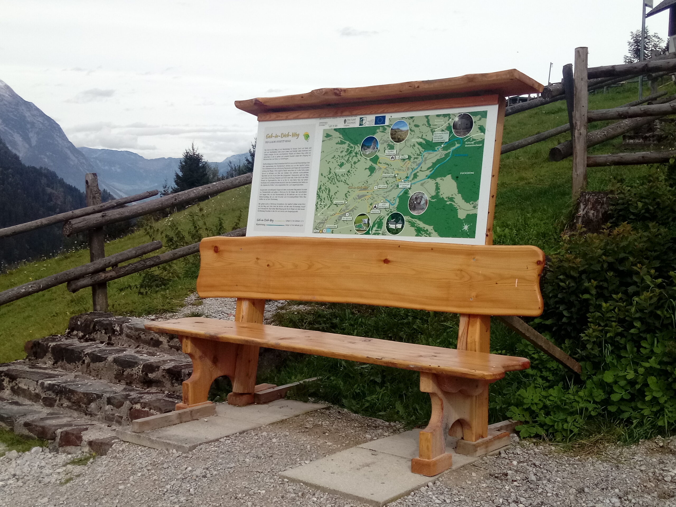 Das Projekt „Geh in dich Weg“ entstand aus dem Wunsch, einen Weg zu schaffen, bei dem sich Menschen nicht nur körperlich sondern auch geistig betätigen. Auf dem Rundweg (mit Anbindung an bereits bestehende Wege, zum Beispiel den Donnersbacher Klammsteig) sollen verschiedenen Stationen mit Ruhe- und Spielbereichen sowie Stationen mit Beschilderungen entstehen (Sinnsprüche, Zitate, ….) die zum Nachdenken anregen. Errichtung eines Weges, der einlädt, über die Natur, das Leben und Sterben und unseren Glauben nachzudenken, in sich zu gehen.