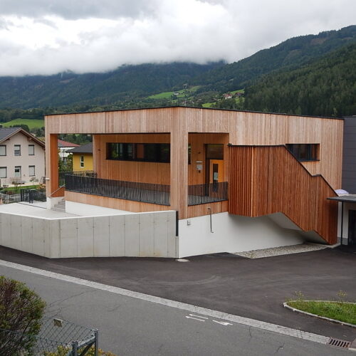 Die Bauausführung nimmt natürlich auf die Anforderungen der Barrierefreiheit Rücksicht. Die Eingänge Schule/Kindergarten sind getrennt, das Gebäude jedoch im Inneren soweit verbunden, dass Anlagen (Turnsaal, Sportplatz etc.) gemeinsam genutzt werden können.