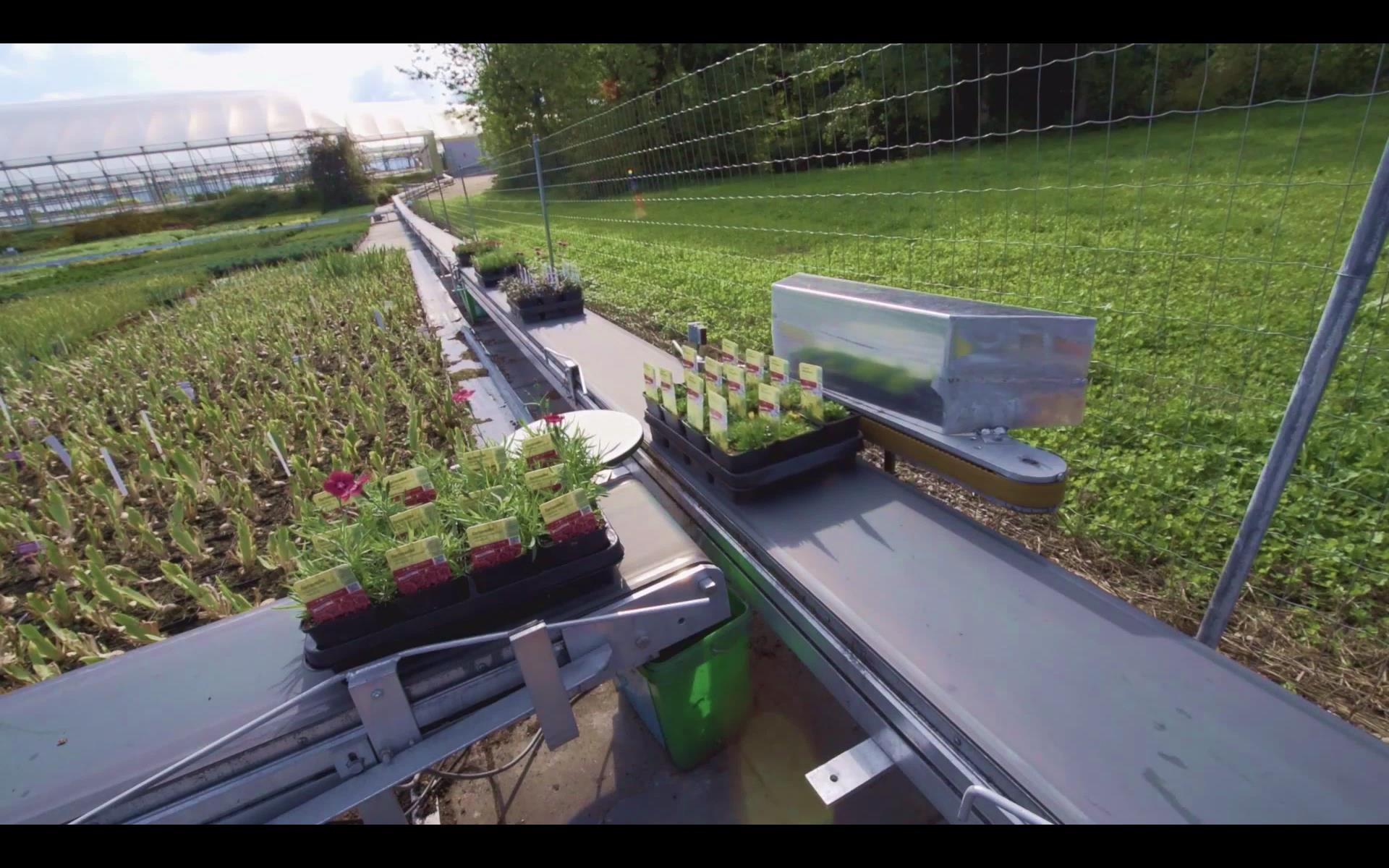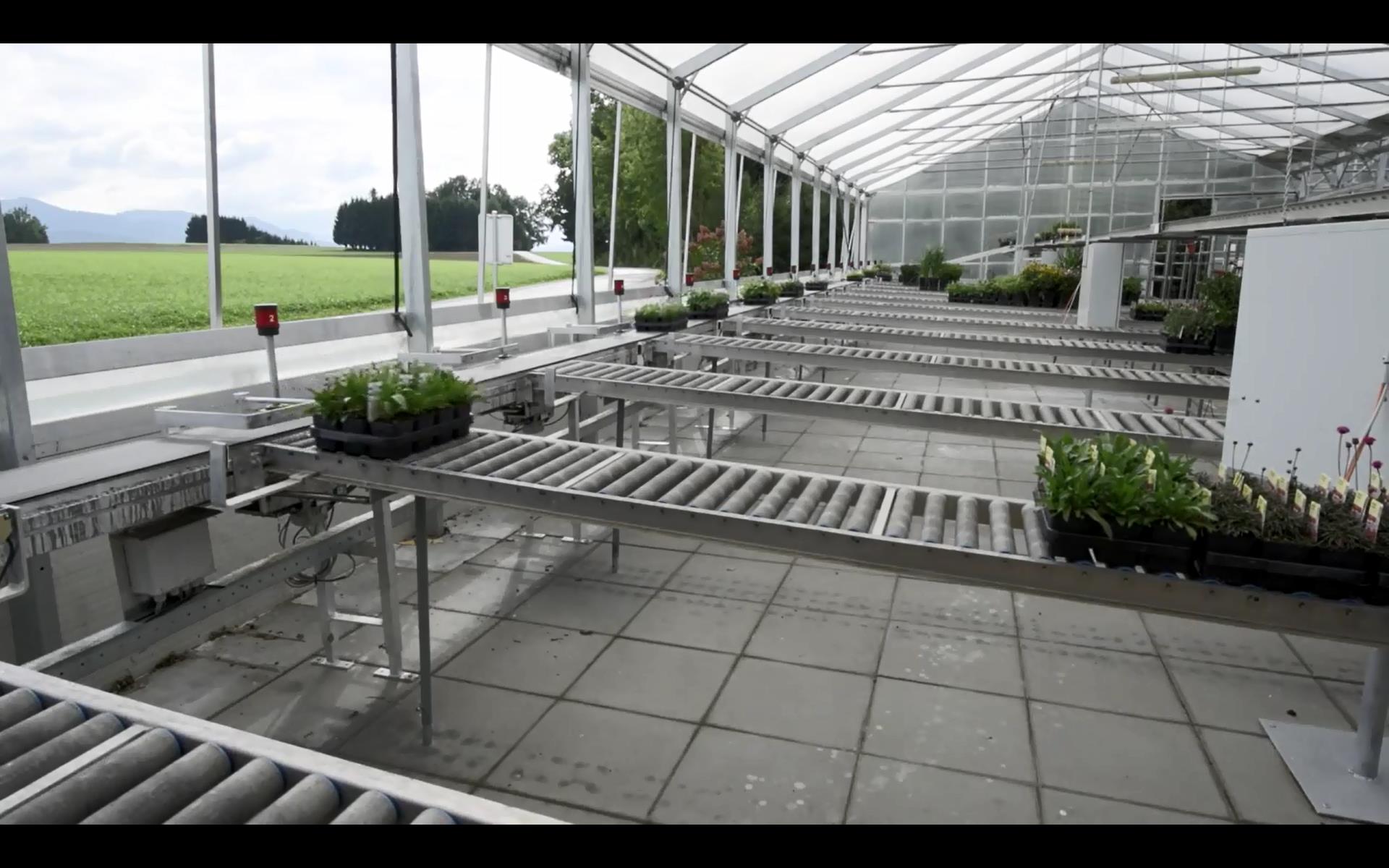 - Über den Großteil der Gärtnerei wird ein durchgängiges Förderbandsystem gelegt, das Freiflächen, Topfmaschine und Kommissionierbereich miteinander verbindet.