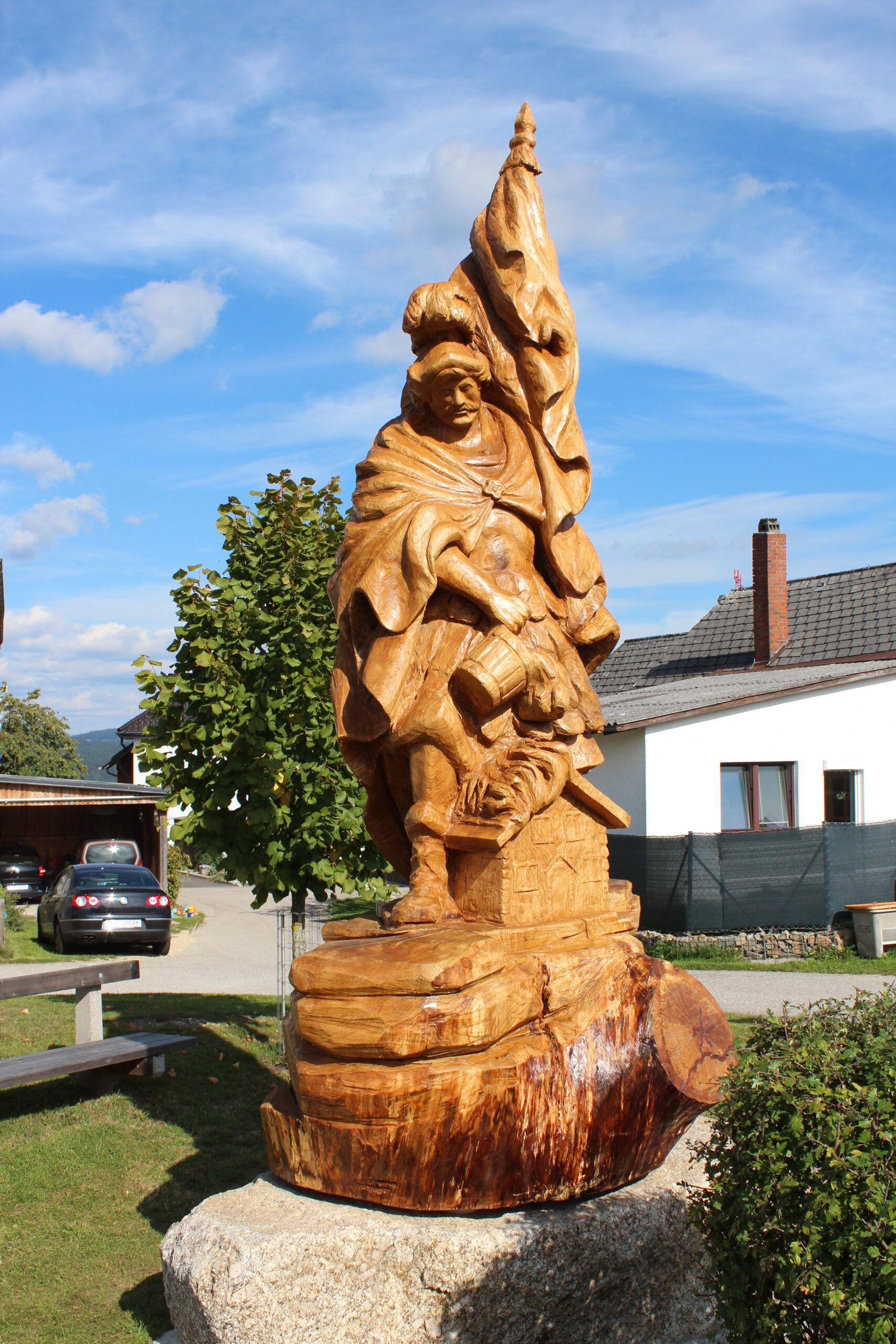 - Anfertigung einer übermanngroßen Heiligenstatue, des Hl. Florian als Landes- und Dorfpatron, welche über das Dorf und den Dorfplatz wachen soll.
