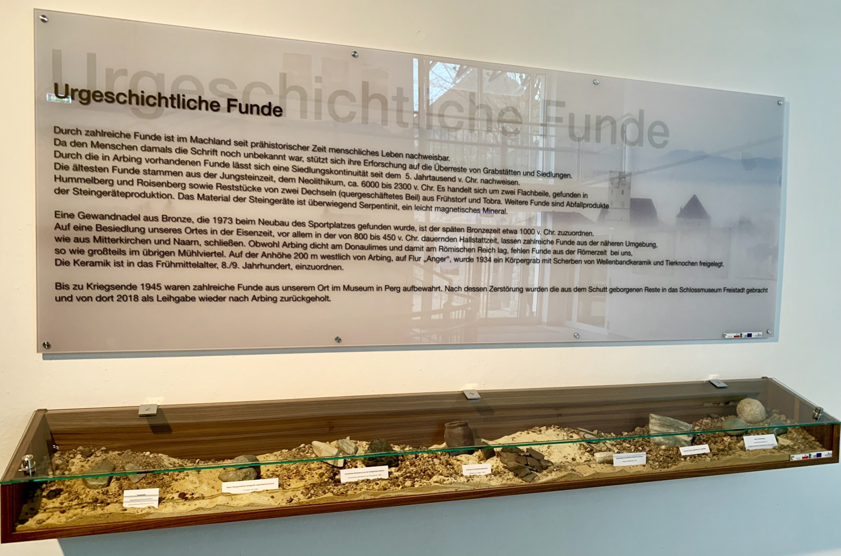 In der Gemeinde Arbing sind urgeschichtliche Funde aufgetreten. Es handelt sich dabei um Gefäßscherben, Werkzeuge, Gewandnadeln etc. Diese wurden der Bevölkerung durch diese Kleinprojekt nachhaltig zugänglich gemacht. Im Foyer des Veranstaltungssaales am Schlossberg wurde eine Vitrine mit grafischen Erläuterungstafeln aufgestellt. Der Wanderweg geht direkt daran vorbei, mit Hinweistafeln wird auf die Ausstellung aufmerksam gemacht.