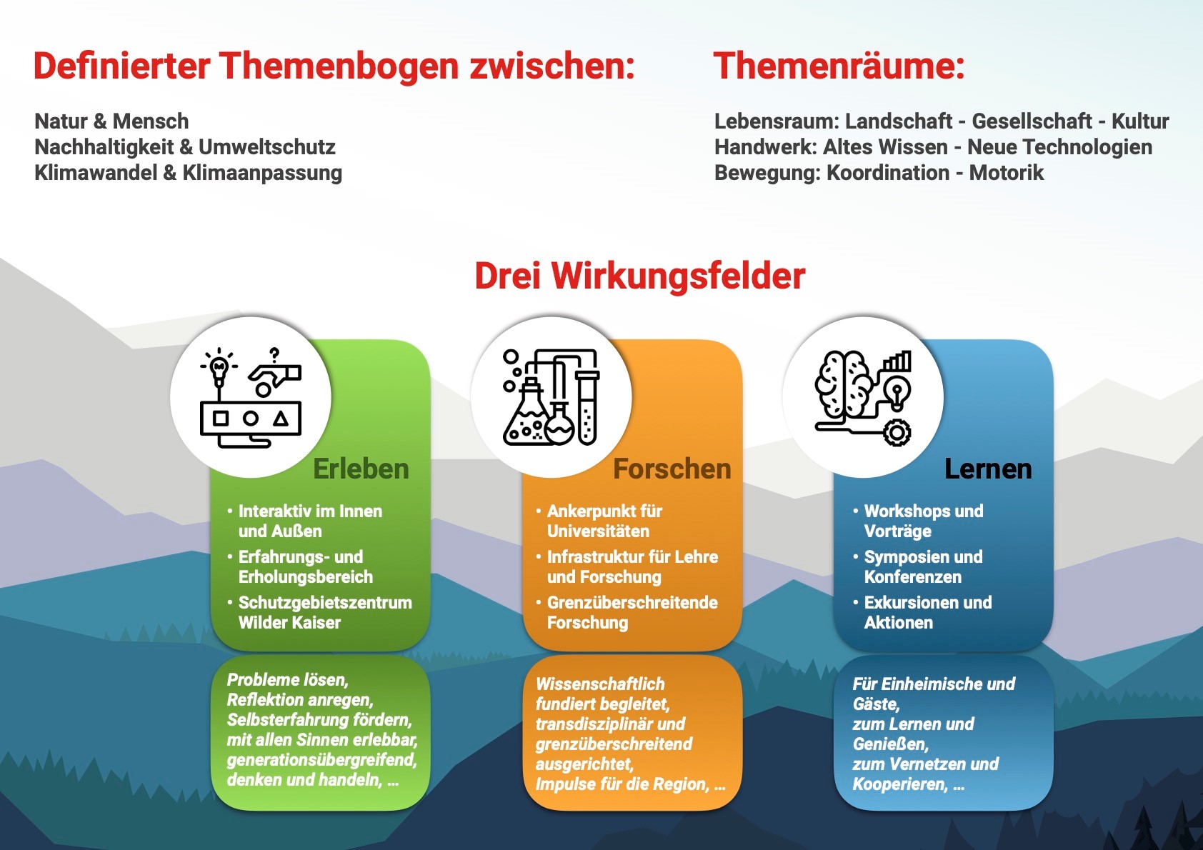 Im Oktober 2019 fand ein breit angelegter Ideenfindungsprozess in Form eines zweitägigen Workshops statt. Letztlich wurde das Vorhaben auf den Ebenen “Indoor”, “Outdoor”, “Region Wilder Kaiser” sowie “Überregionale Vernetzung” aufgebaut und für die Wirkungsfelder “Erleben”, “Forschen” und “Lernen” konzipiert.