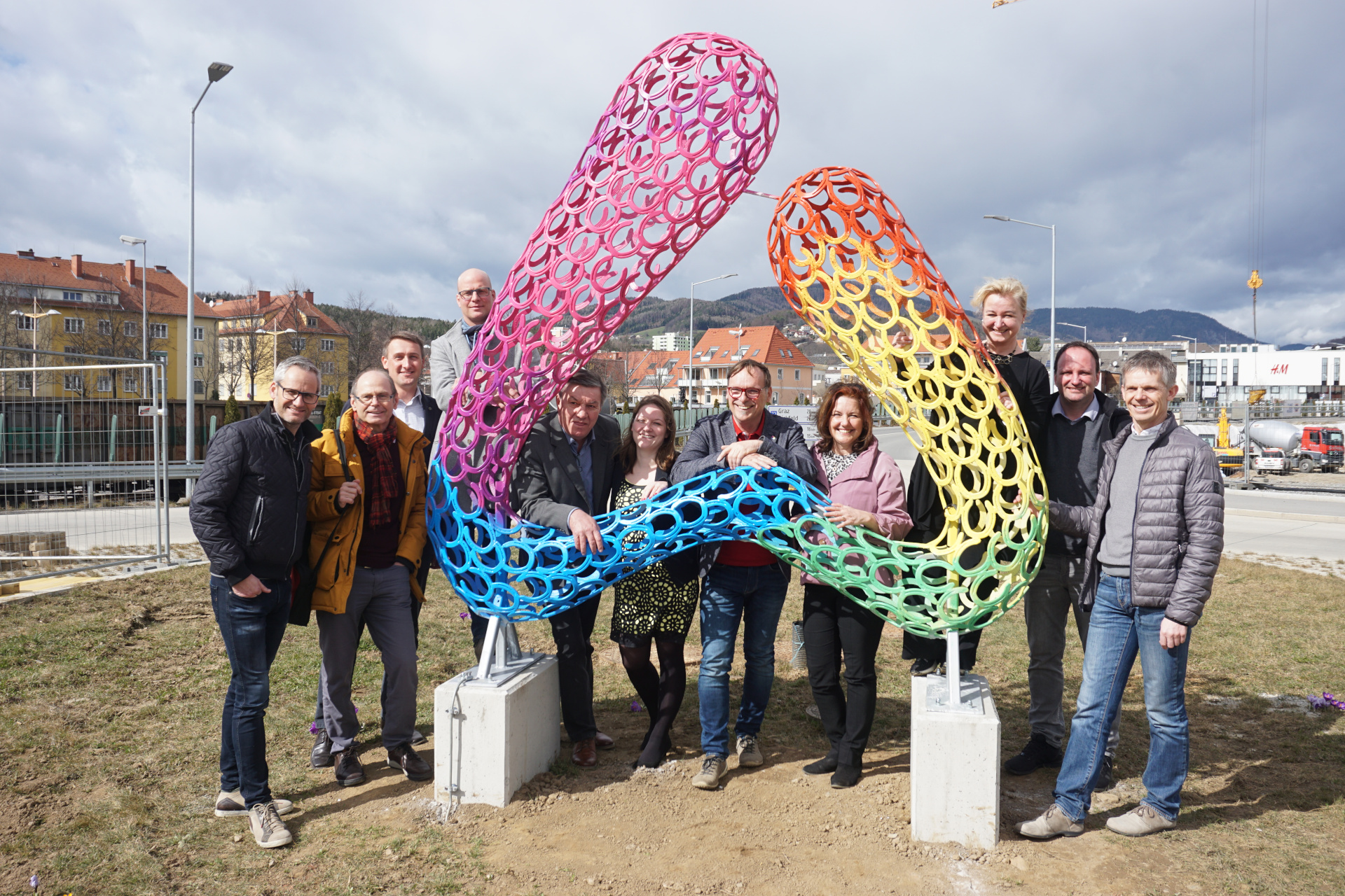 Bei der Wahl des Werkstoffes, aus welchem das Kunstobjekt angefertigt wird, fiel die Entscheidung auf Hufeisen, da diese eine große Langlebigkeit besitzen und in weiterer Folge die Kosten für die Instandhaltung/Wartung gut kalkulierbar sind. Auf Basis der eingelangten Angebote wurde der Auftrag zur Fertigung der zehn Hufeisenskulpturen an den Künstler Sascha Exenberger („Almart“) vergeben.