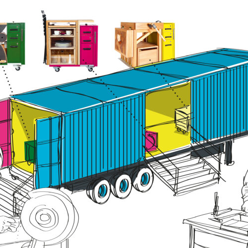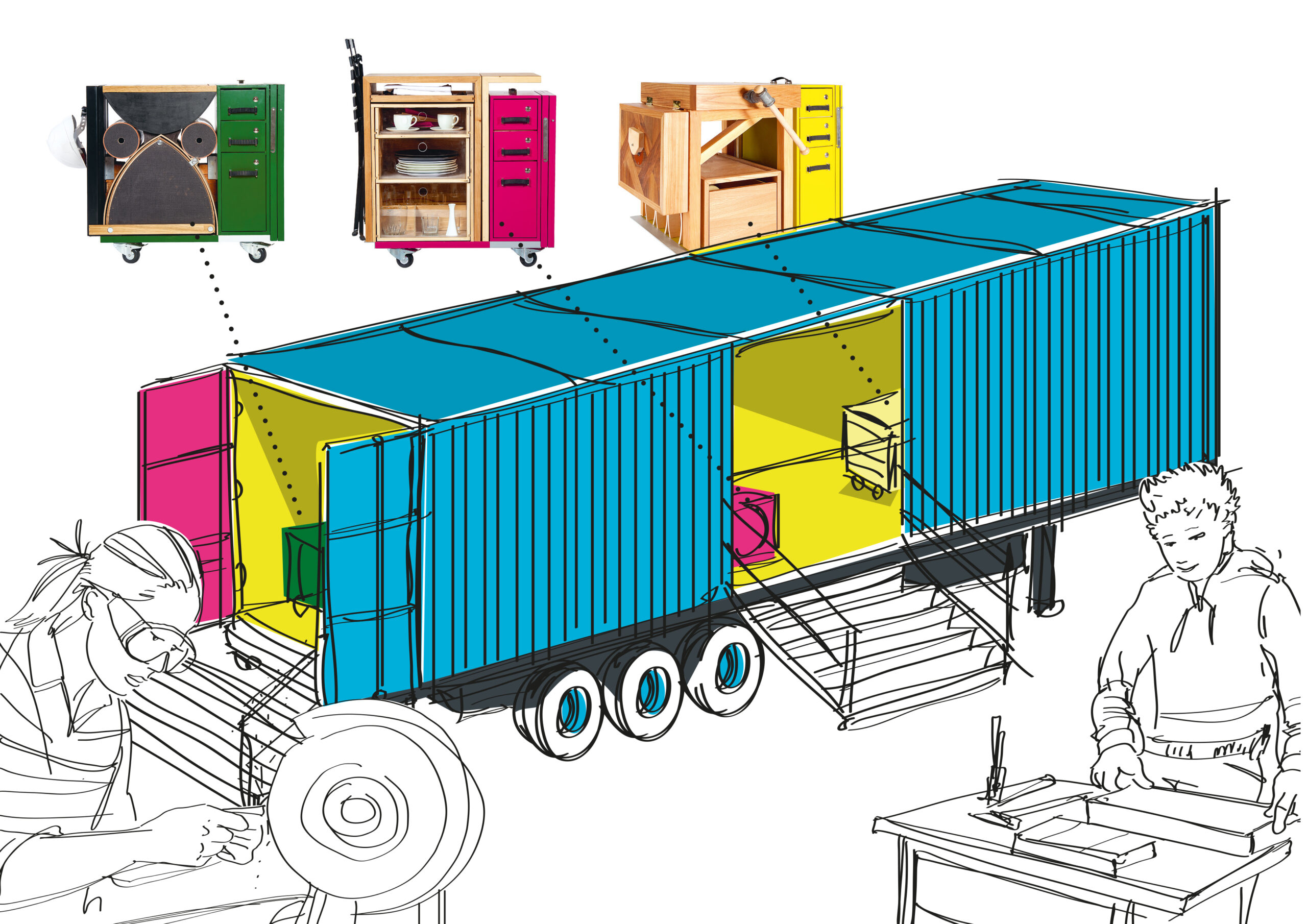 Dazu wird ein Seecontainer wird zu einer spektakulären Lern- und Begegnungswelt umgebaut und mit einem technisch anspruchsvollen MakerSpace ausgestattet, in dem viele klassische Handwerksberufe und neue digitalisierte Berufsbilder präsentiert werden.