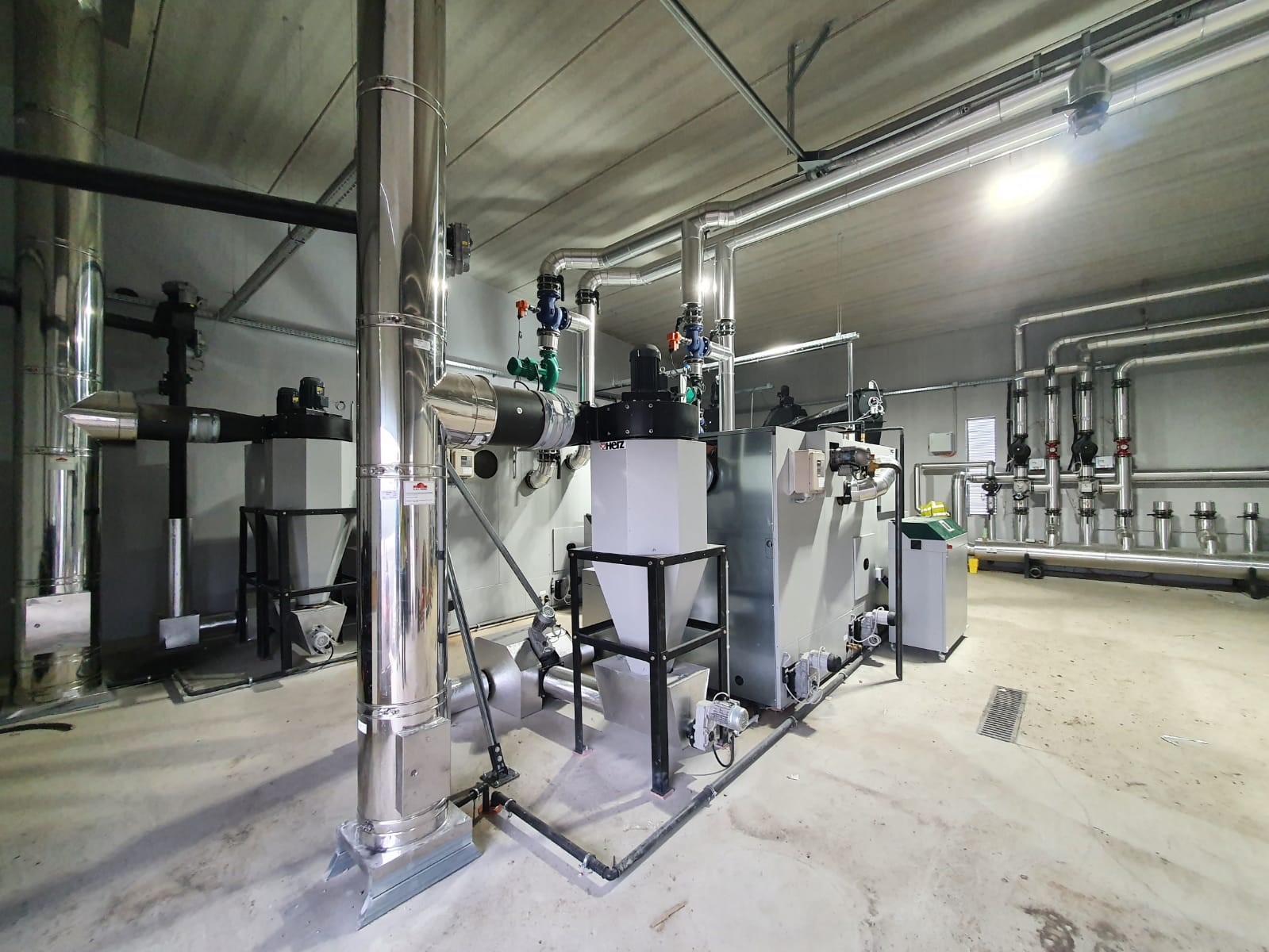 Die Biomasseheizanlage besteht aus zwei voneinander unabhängig funktionierenden Heizkesseln mit Kapazitäten von 1.000 kW und 500 kW. Zur Überbrückung von kurzen Ausfällen, geringerem Wärmebedarf oder zur Speicherung von Überschußwärme steht ein 600 m³ Pufferspeicher zur Verfügung.