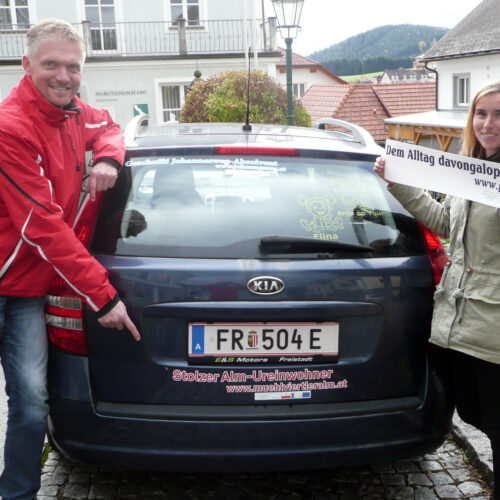 • Kostenlose Verteilung an interessierte BewohnerInnen der Mühlviertler Alm, welche ihr Auto mit einem entsprechenden Aufkleber bekleben wollen und somit als Regionsbotschafter fungieren.