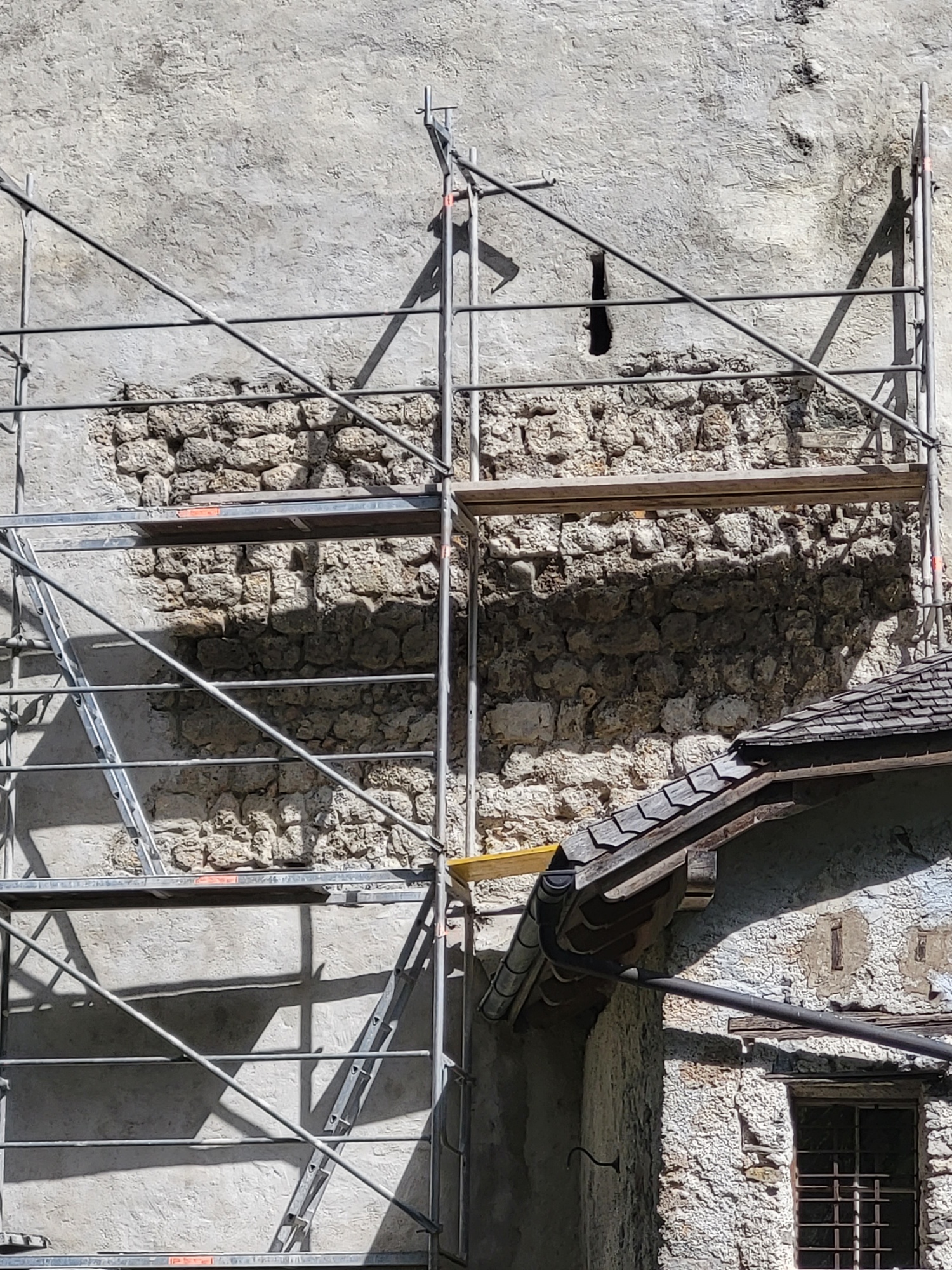 2. Die rezent aufgebrachten Zementverputze sowie die verwitterten Verputze müssen restlos entfernt werden. Dies hat mit größter Vorsicht per Hand zu erfolgen. Es darf dabei keinerlei historisch bedeutsame Schicht verletzt werden.