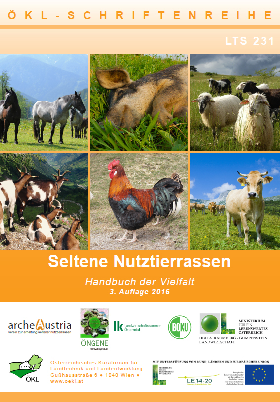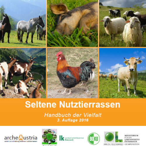 1) Publikationen zur Förderung Seltener Nutztierrassen:- 1.1. Handbuch „Seltene Nutztierrassen – Handbuch der Vielfalt“ – 2. und 3. Auflage je 4.000 Stück (INHALT: Vorwort des Herrn Bundesminister Andrä Rupprechter mit ARCHE Austria Obmann Thomas Strubreiter Erhaltungszucht warum? Vermarktung seltener heimischer Nutztierrassen und ihrer Produkte Aspekte der Wirtschaftlichkeit, 41 ‚Rassensteckbriefe‘ 4 beispielhafte Wirtschaftlichkeitsberechnungen im A4-Format, durchgehend farbig, ca. 200 Fotos, Tabellen, Übersichten, 112 Seiten, Das ÖNGENE-Generhaltungsprogramm, ÖPUL-Maßnahmen und Förderungen, Erhaltung seltener Nutztierassen international, Übersicht über Spartenbetreuer und Verantwortliche Organisationen.