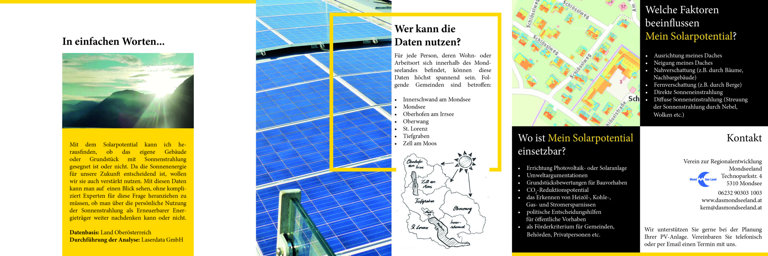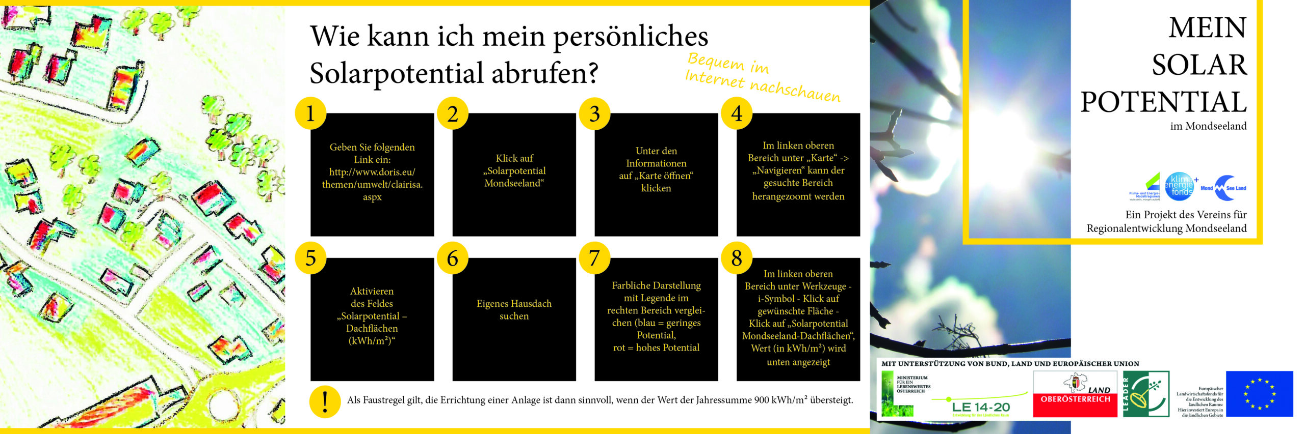 Weltweit bisher einzigartige Verfahren und Methoden konnten vonseiten österreichischer ExpertInnen im Bereich der Erstellung von Solarkatastern/Solarpotential entwickelt werden. Beispiele sind landesweite Ableitungen von Gebäudemodellen aus Laserscanningdaten und deren Nutzung, großflächige Erstellung von Solarkatastern für Gebäudefassaden, Berechnung des Solarpotentials von Dachflächen auf Basis hoch aufgelöster Oberflächenmodelle und noch weitere höchst komplexe Anwendungsfelder und Berechnungsmethoden. Einige Gebiete in Österreich haben es bereits vorgemacht: Die Bundesländer Tirol, Vorarlberg und Kärnten sowie auch der Bezirk Osttirol, Landeck oder auch die Stadt Innsbruck sowie auch Bereiche in der Schweiz oder in Deutschland können als Vorreiterregionen und Referenzprojekte angeführt werden. Der Start der Initiativen ging nicht selten von kleineren räumlichen Ebenen aus – für die schließlich flächendeckende Berechnung des Land Salzburg beispielsweise etablierte sich der Regionalverband Salzburger Seenland als die treibende Kraft. Auch Energieinstitute, Regionsmanagements, LEADER Regionen, Ämter der Landesregierung oder Kommunalbetriebe konnten durch viel Engagement die zum Teil überregionalen Analysen realisieren.Die KEM Mondseeland und LEADER-Region FUMO – als grenzübergreifende Region – setzten sich zum Ziel, das zu einem bereits großen Flächenanteil vorhandene Solarpotential der nutzbaren Flächen in den Salzburger Gemeinden mit jenem des Mondseelandes zu ergänzen. Diese wertvolle Information sollte dabei in die Öffentlichkeitsarbeit einfließen und für BürgerInnen transparent und leicht verständlich dargelegt werden (z.B. in Gemeinden aufliegend, Vorführung im Rahmen einer Informationsveranstaltung). Erstmalig in Oberösterreich (bis auf die Landeshauptstadt Linz) konnte diese Maßnahme umgesetzt werden, wodurch die Region als Pilotregion für das Bundesland gesehen werden kann.