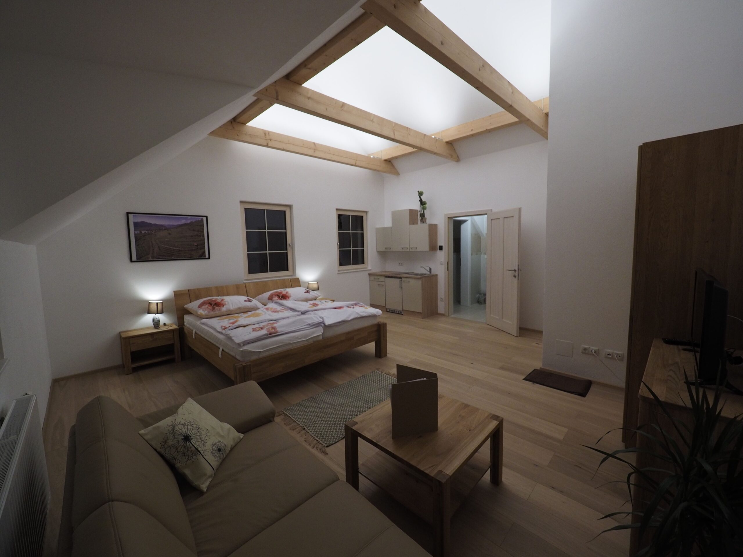 Im Obergeschoß befinden sich 3 Doppelzimmer, Urlaub am Winzerhof, ebenfalls alle Zimmer mit Vollholzmöbel und Boden aus geöltem Eicheparkett.