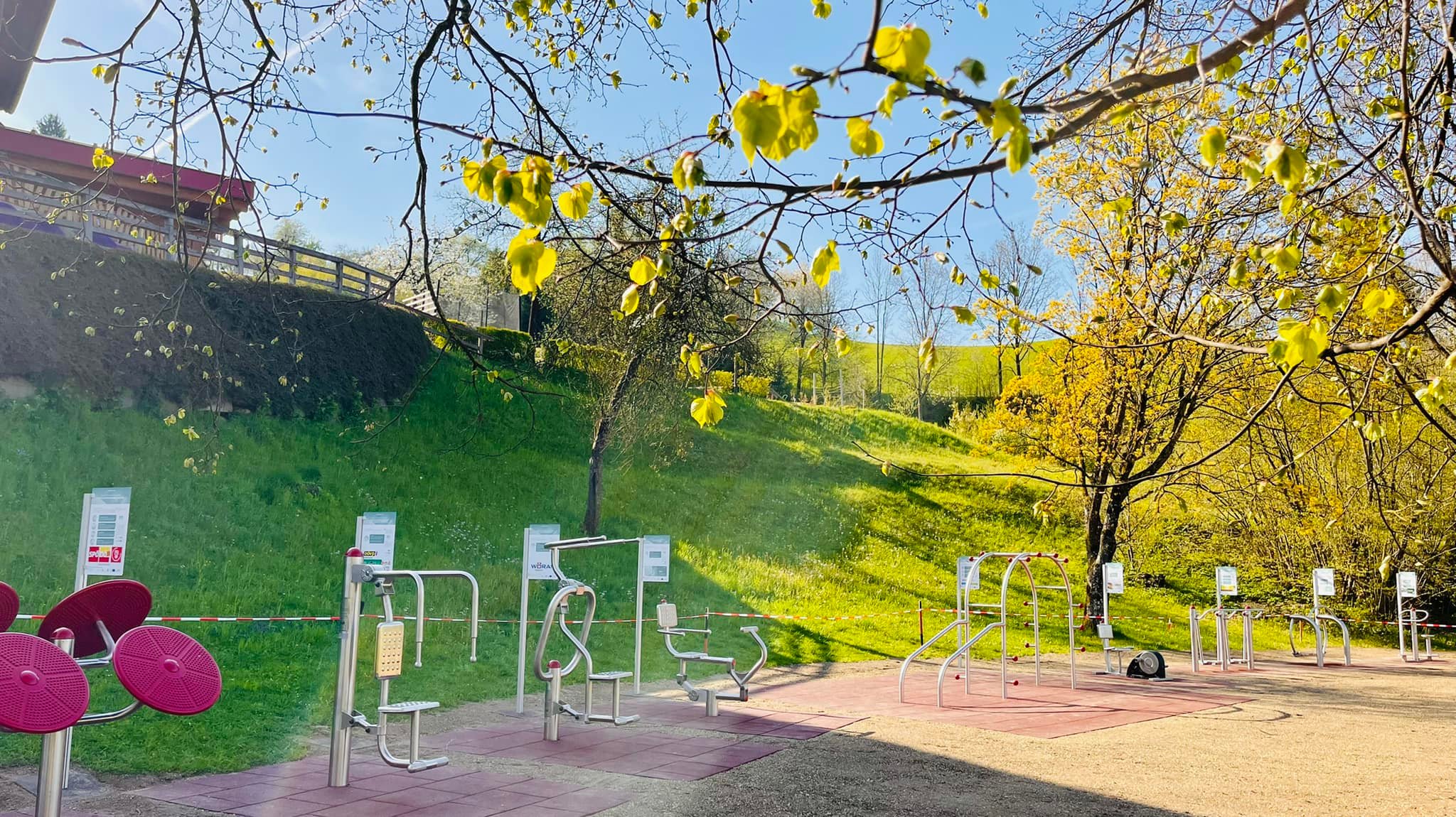 Es entstand ein Fitnesspark mit 10 Geräten auf der Liegewiese beim Badesee Waldhausen mit traumhaftem Ausblick.