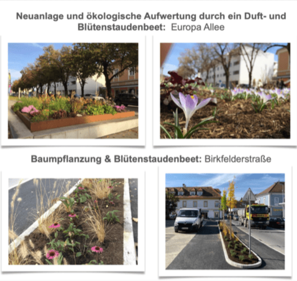 - Innenstadtbegrünung: Ausgehenden von den Ergebnissen des Grünraumplans und den Anregungen der BürgerInnen wurden neue Grünflächen an strategischen Orten und Plätzen geschaffen, um die Klima- und Begrünungssituation deutlich zu verbessern.