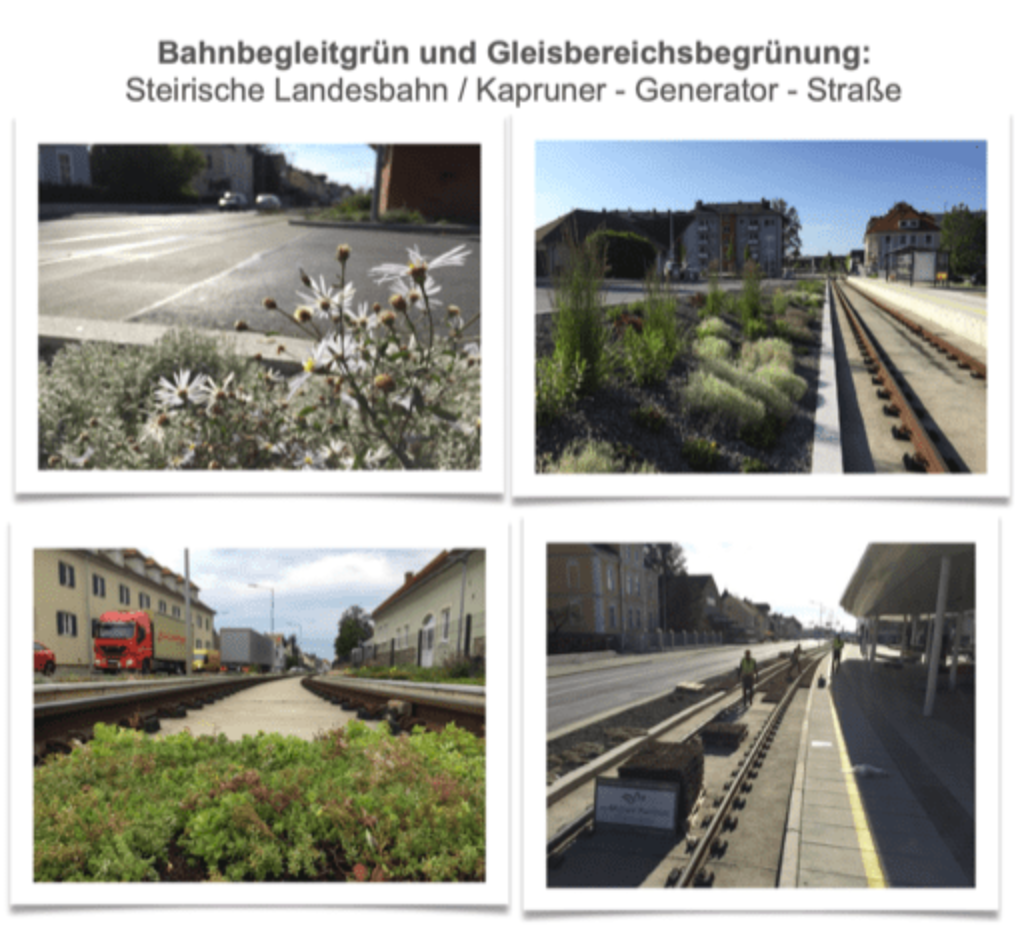 - Gleisbegrünung: Es sollte auch getestet werden, ob eine generelle Begrünung der tristen Gleisanlagen im Stadtgebiet möglich und wirksam ist. In Abstimmung mit der Landesbahn wurde daher ein Teststreifen in Ausmaß von 60qm vor der Haltestelle Mitte begrünt, um zusätzliche Informationen über die Machbarkeit dieses Vorhabens zu sammeln.