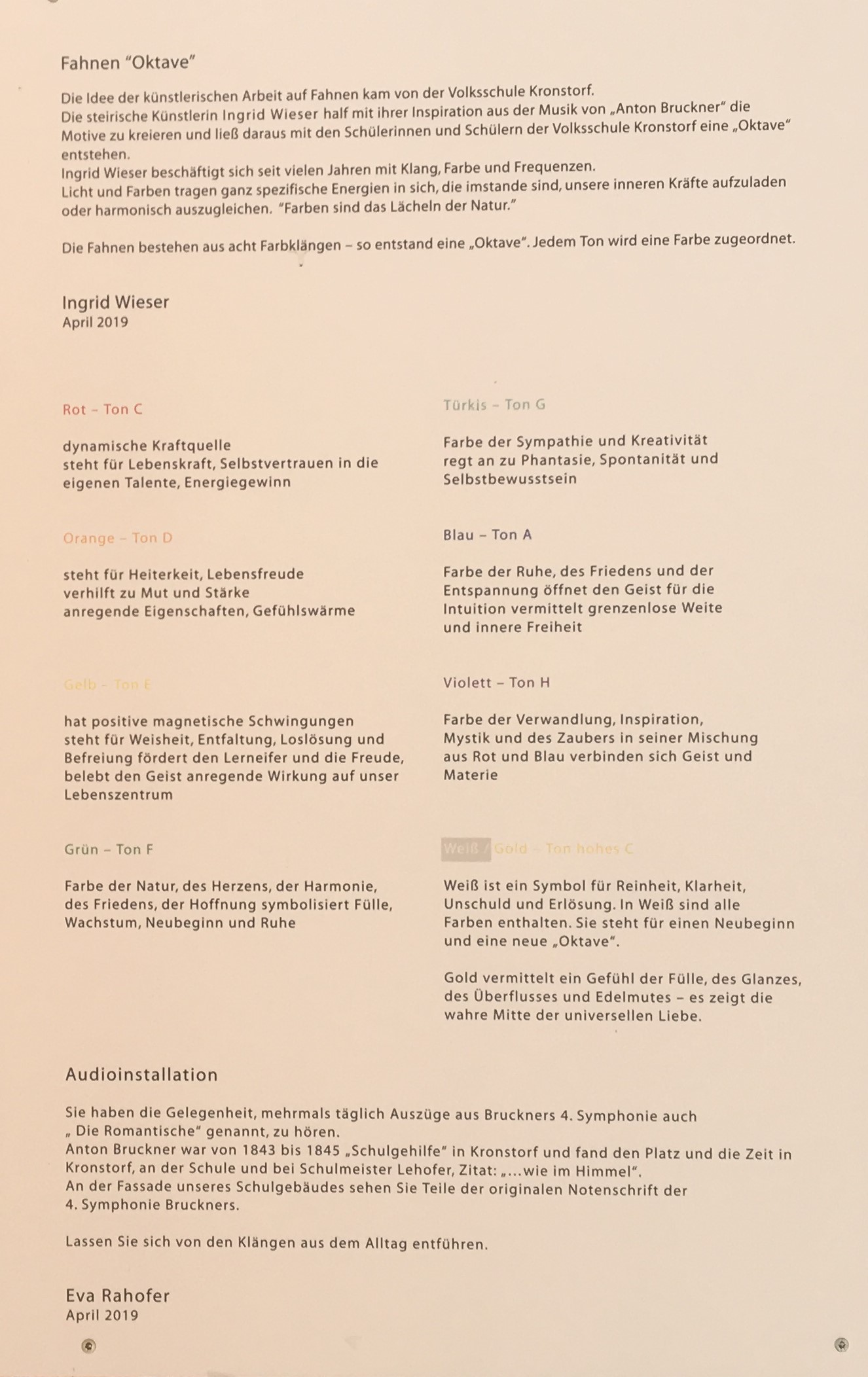 Der Versuch Anton Bruckner den Schüler*innen näher zu bringen, seine Person und die Klänge seiner Musik. Dabei selbst kreativ tätig zu werden, sich ein zu lassen auf einen künstlerischen Akt ist ein weiteres Ziel.Die Audioinstallation im öffentlichen Raum der Marktgemeinde Kronstorf soll die Bewohner*innen für Anton Bruckner sensibilisieren, überraschen, das Warten auf den Autobus (die Bushaltestellen befindet sich auch unter dem Vordach) interessanter und anders machen.