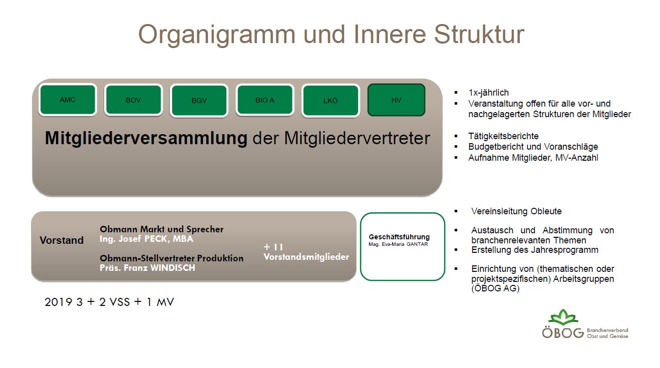 Die Mitglieder repräsentieren im Wesentlichen den Obst- und Gemüsesektor. Die Repräsentanz begründet sich in der Anzahl der Mitglieder, davon statistisch abgeleiteter Flächen oder auch durch den Wert vermarktbarer Erzeugnisse. Aktuelle Mitglieder sind der Bundesobstbauverband (9 Landesobstbauverbände), der Bundesgemüsebauverband (5 Landesgemüsebauverbände), die Landwirtschaftskammer Österreich (9 Landes-Landwirtschaftskammern), BIO AUSTRIA (8 Landesorganisationen) und der amc(agrar management club)AUSTRIA, als Vertreter (Verein) der 9 Erzeugerorganisationen für Obst und Gemüse:– EO Steirisches Gemüse GmbH