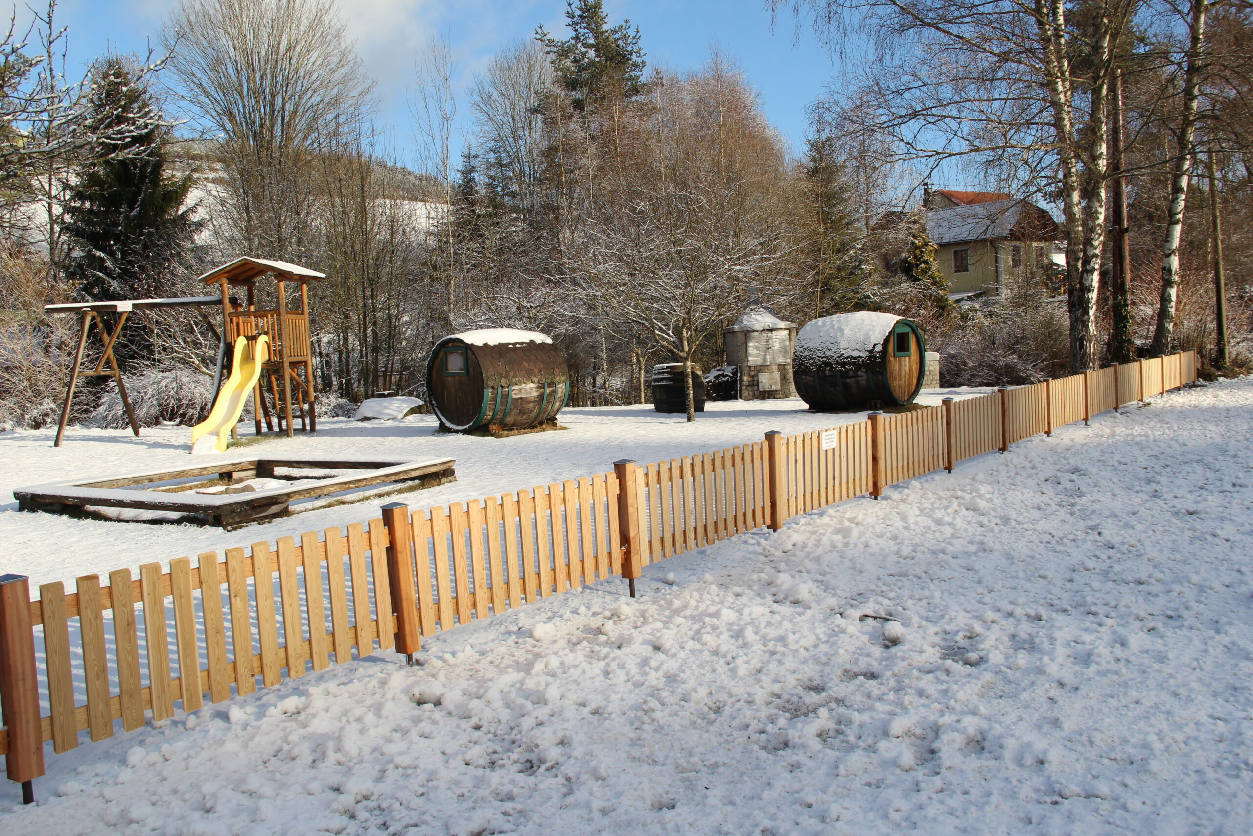 - Errichtung von Sicherheitsmaßnahmen/Einfriedungen aus Holz entlang der Straße und des Flusses