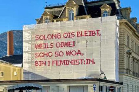 Nach Innsbruck, Salzburg, Linz, Wien, Klagenfurt, Bad Ischl, Washington, Orléans, Ljubljana, Rabat, Köln, Bern, Düsseldorf und zahlreichen weiteren Städten kommt auf Einladung des WEIN/4-Festival 2026 eines der unübersehbaren Kunstwerke ins Weinviertel. Die Künstlerin stickt mit pinkem Tüll im traditionellen Kreuzstich in meterhohen Buchstaben einen SOLANGE-Satz auf das Gerüstnetz an der Westfassade des Siloturms der Hasitschka Agarhandel GmbH in Raasdorf bei Wien. Dieser Satz wird bis zur Eröffnung am 5. Mai geheim bleiben.